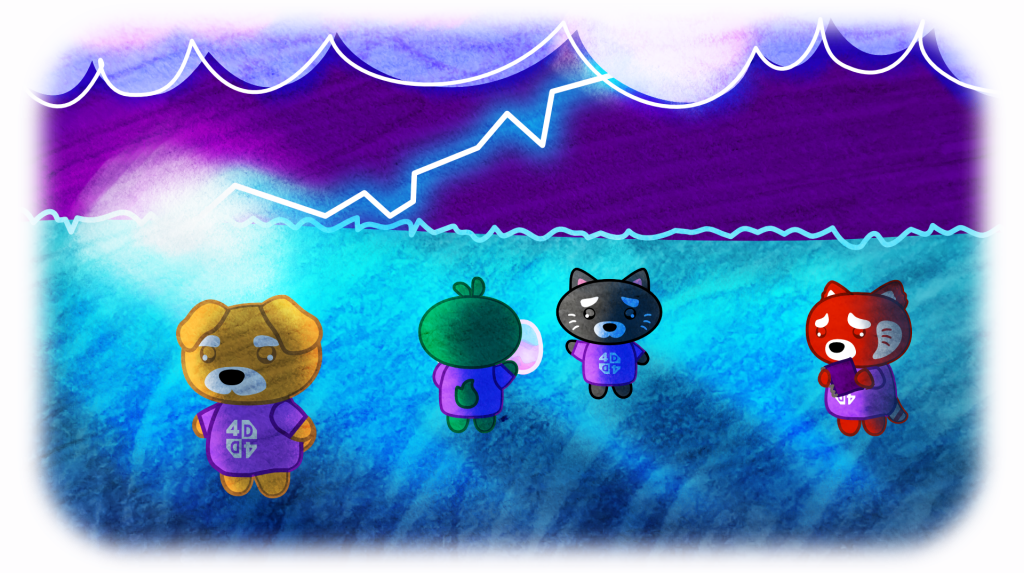 El grupo avanzaba entre descargas y viento, intentando coordinarse. Melanie gritaba indicaciones, Ember intentaba usar su pin sin éxito y Limo mantenía la vista fija en cualquier señal de movimiento que pudiera indicar dónde estaba Sweet. La tormenta les recordaba lo urgente del momento, pero también les recordaba que la habían perdido, y que debían trabajar juntos para rescatarla.