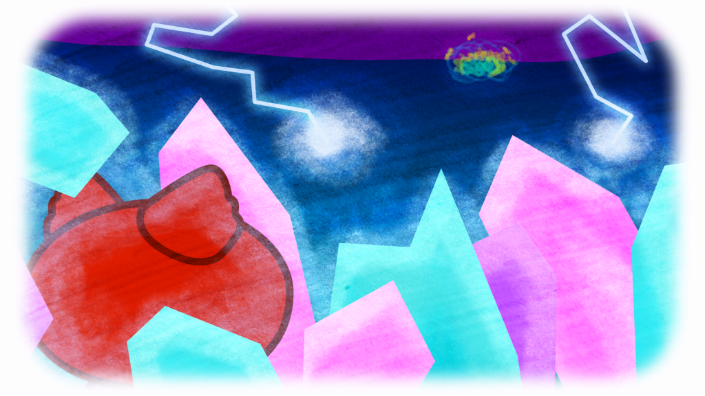 Sweet miró hacia arriba a los cristales que la rodeaban y, al apretar el collar con fuerza, algo dentro de ella la impulsó a mirar más allá de la jaula de recuerdos. A lo lejos, entre la tormenta y las descargas, vio unas luces extrañas parpadeando, pequeñas pero constantes, como si le indicaran un camino. Aunque seguía atrapada, un hilo de determinación se encendió en su interior.