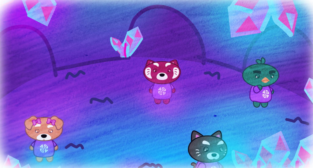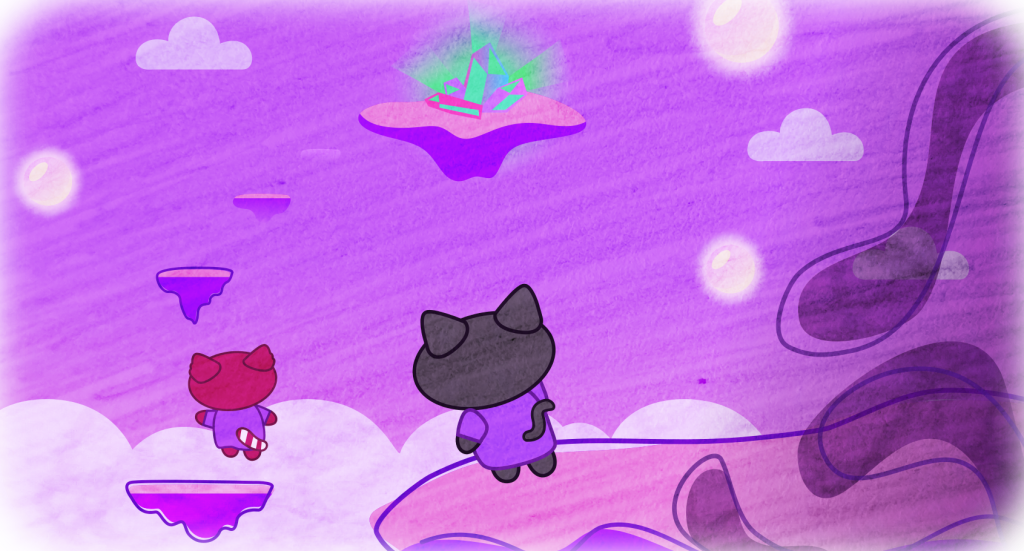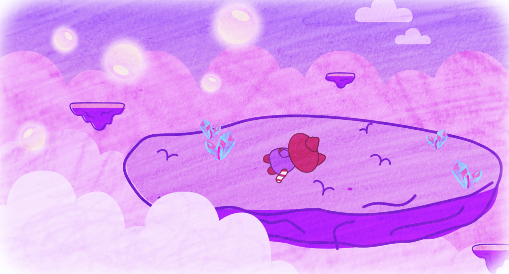 Tras caminar durante mucho tiempo entre la neblina espesa, la visibilidad comenzó a mejorar poco a poco. Frente a ellos apareció una isla mucho más grande que las anteriores. En su borde se alzaba la entrada a una cueva subterránea, rodeada por enormes cristales que brillaban con tonalidades azules, rosas y moradas, iluminando la bruma con reflejos suaves y ondulantes. Sweet se acercó con cautela, observando los destellos.
