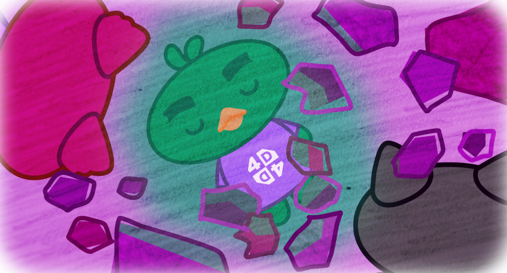 Debajo, medio enterrado, cubierto por una luz parpadeante, yacía un ser de plumas verdes, con cuerpo redondo y rostro adormilado. Parecía un pato, aunque uno bastante fuera de lugar.