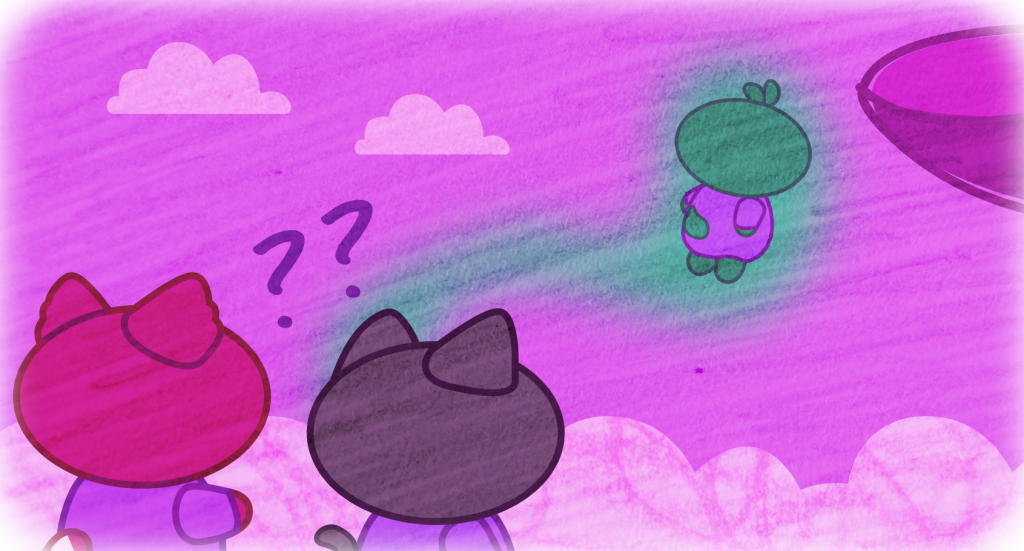 Avanzaron juntas entre la niebla. El terreno cambiaba bajo sus patas: a veces firme como piedra, a veces blando como gelatina, obligándolas a mantener el equilibrio. Las luces seguían bailando en el aire, su brillo intermitente creando un silencio luminoso que parecía observarlas con atención. Cada cierto tiempo, un tentáculo emergía de entre las nubes, envolvía una roca flotante o atrapaba una sombra alada antes de volver a desaparecer.