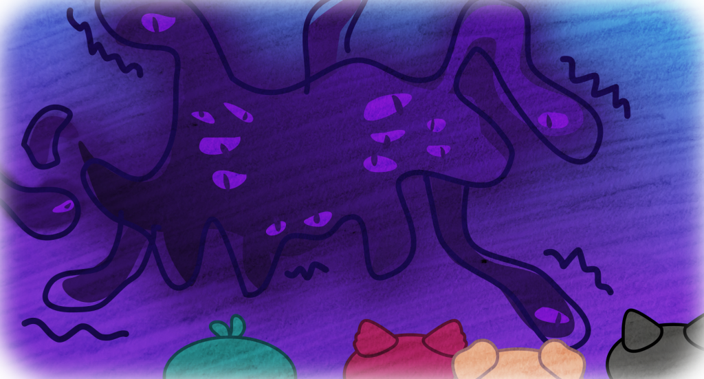 De pronto, unas figuras sombrías y deformes salieron de las paredes, atacándolos al mismo tiempo. Sweet y Ember corrieron de regreso, al igual que Limo y Melanie. Al encontrarse en una cámara central, las criaturas se fusionaron en una masa oscura con múltiples ojos brillantes.